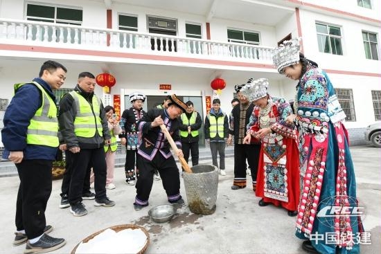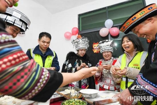 近日,中鐵十七局渝湘高鐵重慶至黔江段項(xiàng)目部漢、苗、土家三族職工一同貼春聯(lián)、掛燈籠、打糍粑、包餃子,喜迎春節(jié)的到來(lái)。渝湘高鐵重慶至黔江段是國(guó)家中長(zhǎng)期鐵路網(wǎng)規(guī)劃“八縱八橫”中廈渝通道的重要組成部分,為保障3月初全線無(wú)砟軌道順利施工,早日實(shí)現(xiàn)通車(chē)目標(biāo)。今年春節(jié),項(xiàng)目集結(jié)團(tuán)結(jié)班組,共有40余名職工堅(jiān)守項(xiàng)目工地過(guò)春節(jié),加速工程建設(shè)。項(xiàng)目在建設(shè)期間積極推進(jìn)勞務(wù)用工屬地化,吸納當(dāng)?shù)厣贁?shù)民族工人組成團(tuán)結(jié)班組,并實(shí)行一對(duì)一“導(dǎo)師帶徒”。3年時(shí)間里,30余名少數(shù)民族員工紛紛學(xué)有所成,成為有技術(shù)、文化的產(chǎn)業(yè)工人,有效解決當(dāng)?shù)厣贁?shù)民族青年就業(yè)問(wèn)題,助力鄉(xiāng)村振興。