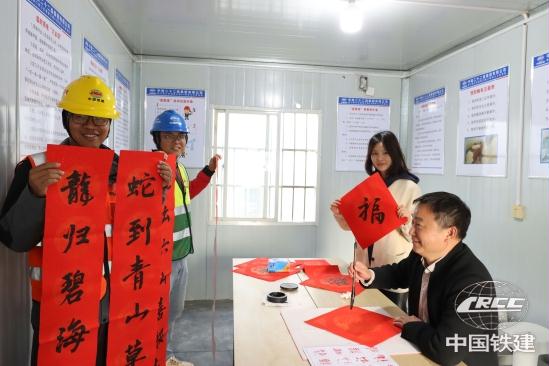 項(xiàng)目部為工友們寫(xiě)春聯(lián)(茍文 攝)
